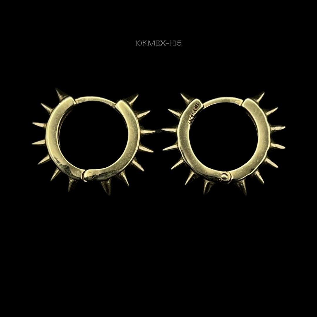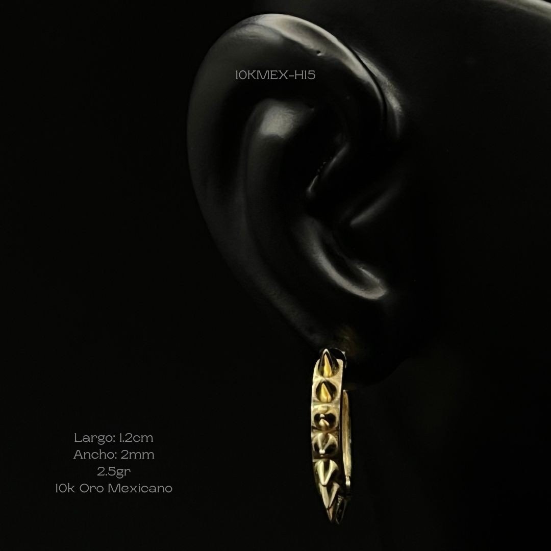 Hoops de 10k Mexicano con diseño de picos. Medidas: 1.2cm de largo y 2mm de ancho. Gramaje: 2.5gr. Precio sujeto a las cotizaciones diarias del oro.