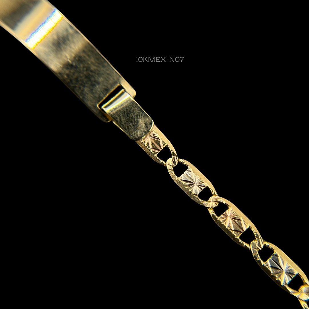 Esclava infantil 10k Mexicano de tejido gucci en oro florentino con diseño central de un destello y placa lisa. Medidas: 12cm de largo, 5mm de ancho en placa y 3mm de ancho en cadena. Gramaje: 2.6gr. Precio sujeto a las cotizaciones diarias del oro.