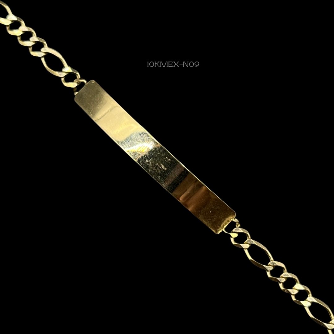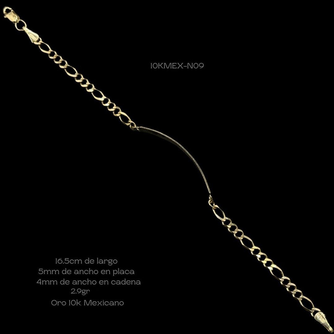 Esclava infantil 10k Mexicano de tejido cartier con placa lisa. Medidas: 16.5cm de largo, 5mm de ancho en placa y 4mm de ancho en cadena. Gramaje: 2.9gr. Precio sujeto a las cotizaciones diarias del oro.