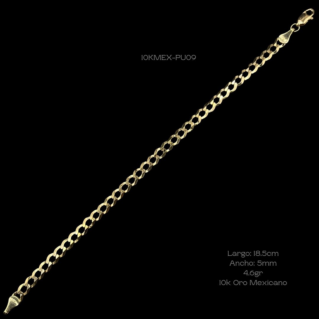 Pulso de 10k Mexicano de tejido barbado. Medidas: 18.5cm de largo y 5mm de ancho. Gramaje: 4.6gr. Precio sujeto a las cotizaciones diarias del oro.