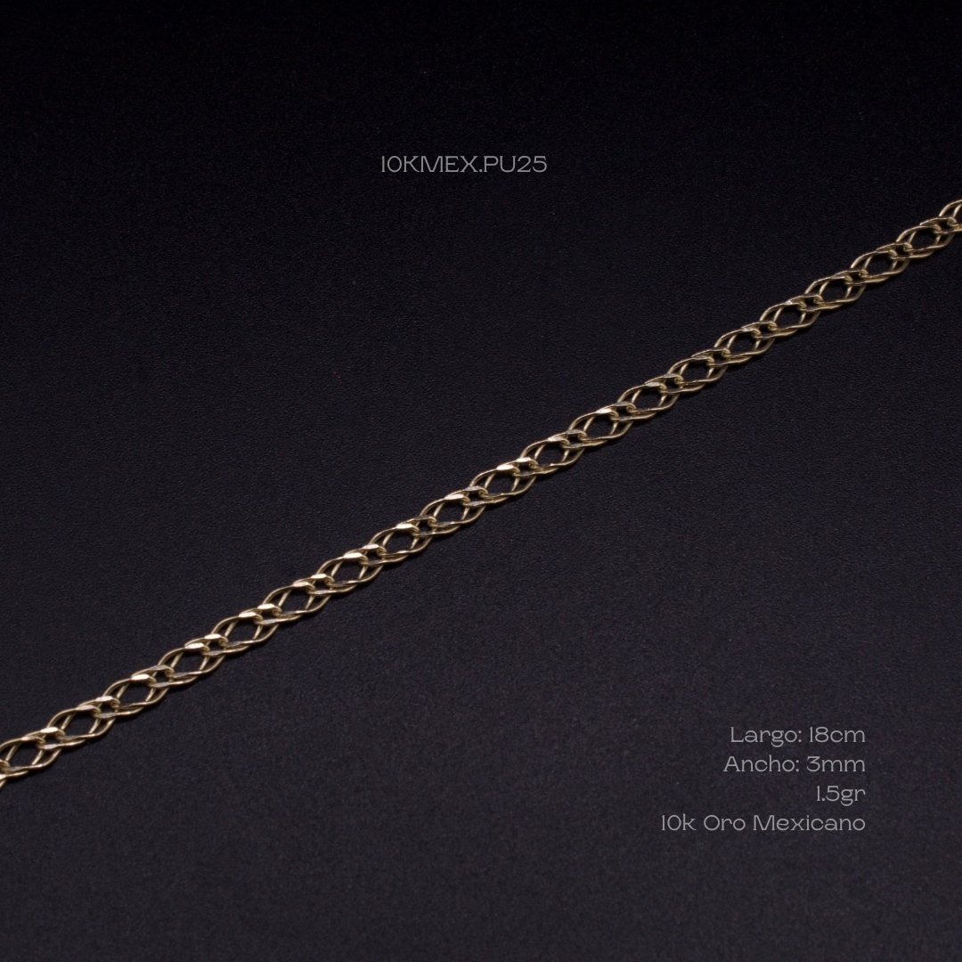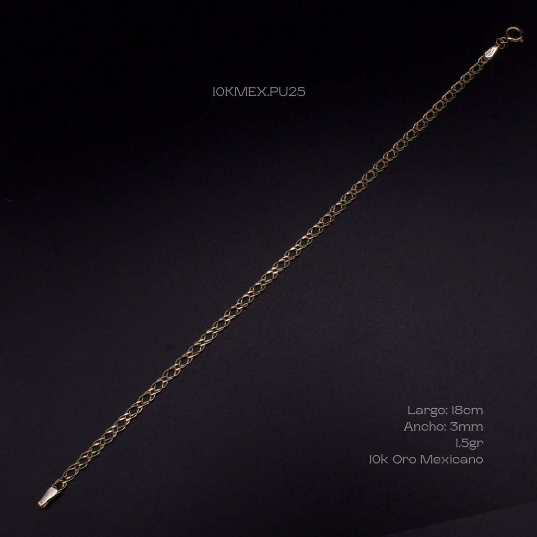 Pulso de 10k Mexicano de tejido barbado doble. Medidas: 18cm de largo y 3mm de ancho. Gramaje: 1.5gr. Precio sujeto a las cotizaciones diarias del oro.