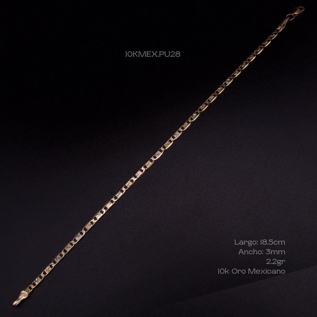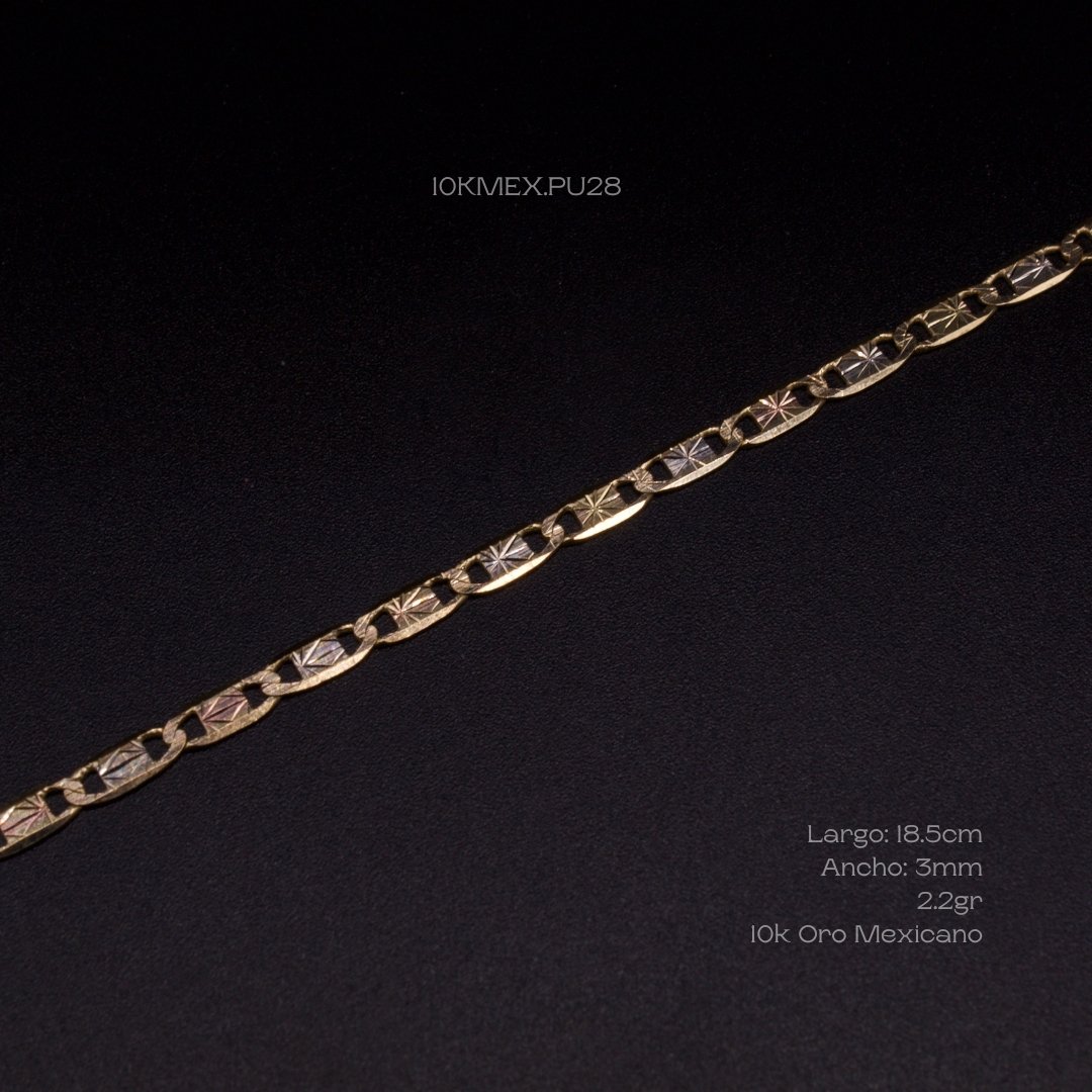 Pulso de 10k Mexicano de tejido gucci. Medidas: 18.5cm de largo y 3mm de ancho. Gramaje: 2.2gr. Precio sujeto a las cotizaciones diarias del oro.