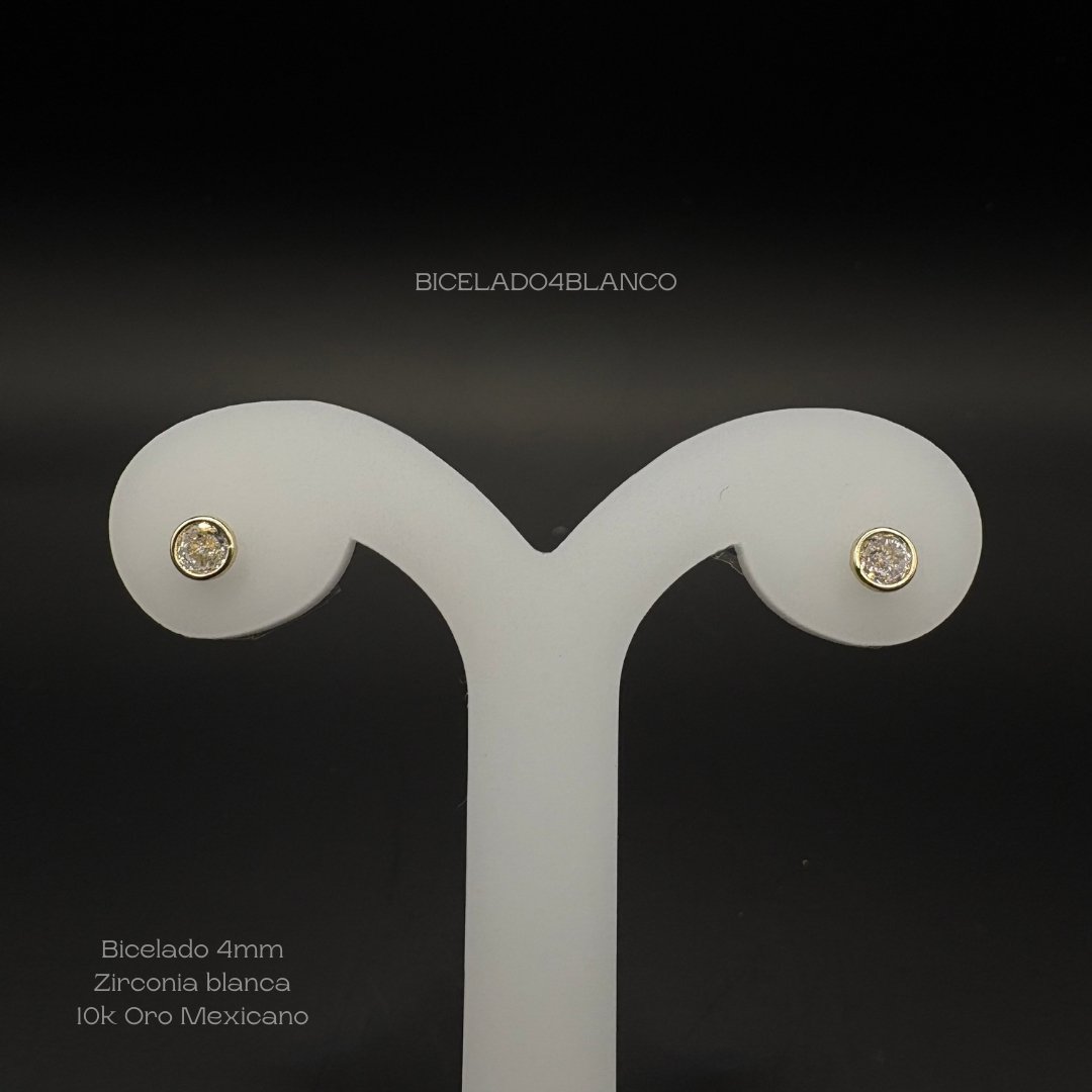 Broquel de 10k Mexicano con diseño bicelado con zirconia de 4mm en color blanco. Precio sujeto a las cotizaciones diarias del oro.