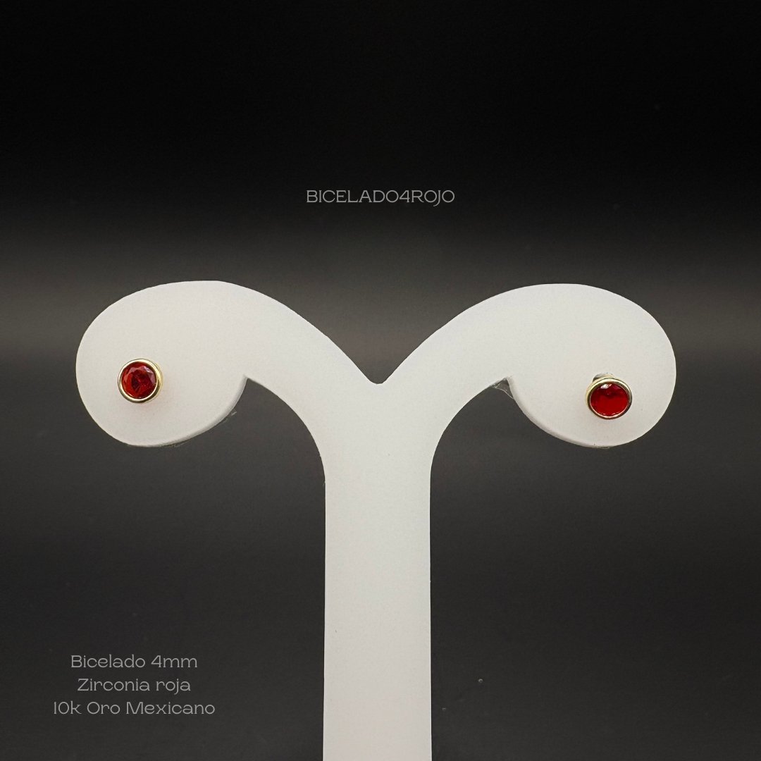 Broquel de 10k Mexicano con diseño bicelado con zirconia de 4mm en color rojo. Precio sujeto a las cotizaciones diarias del oro.