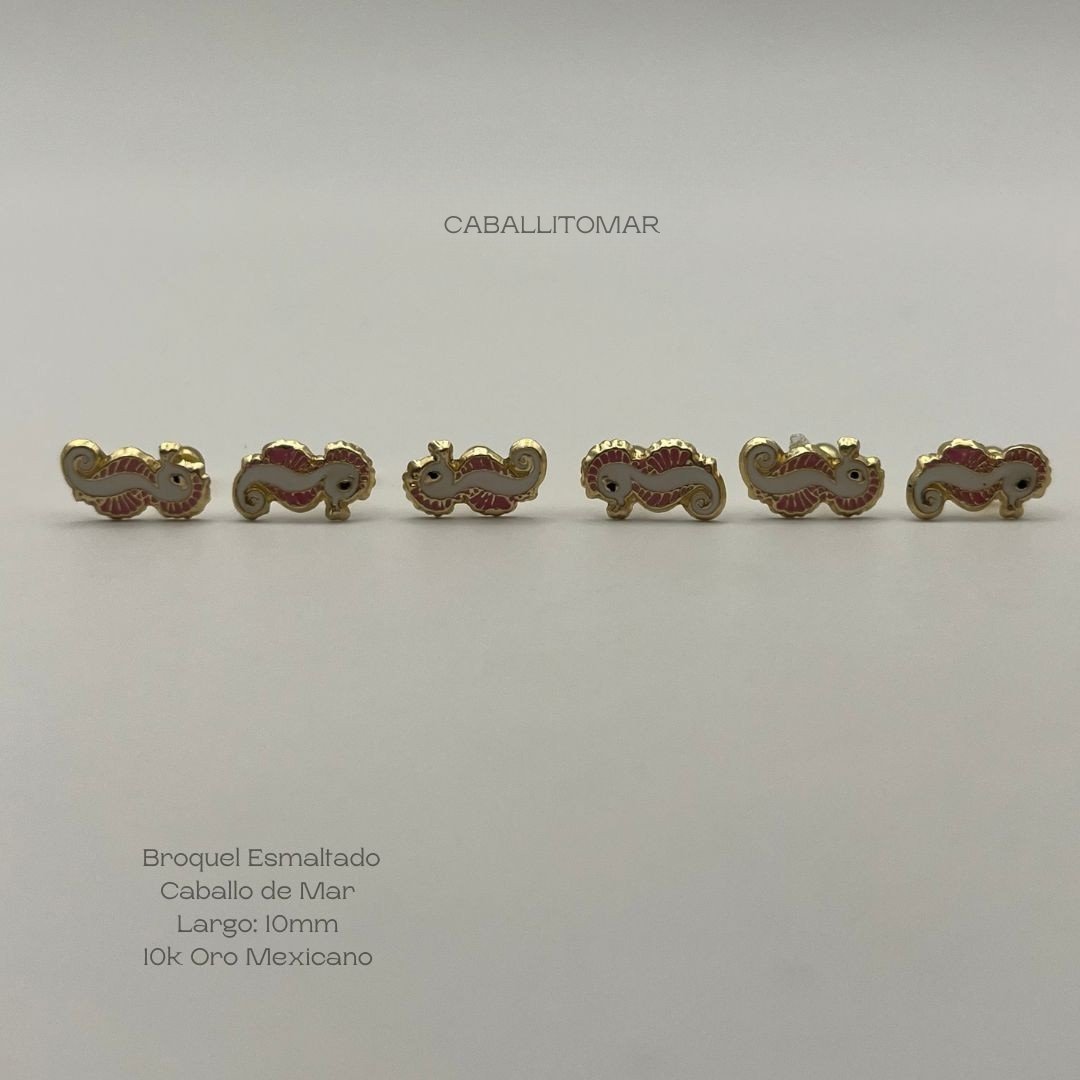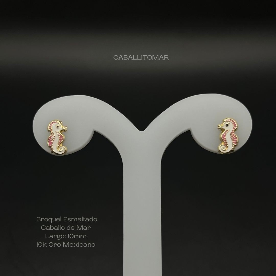 Broquel de 10k Mexicano con diseño esmaltado de caballo de mar de 10mm. Precio sujeto a las cotizaciones diarias del oro.