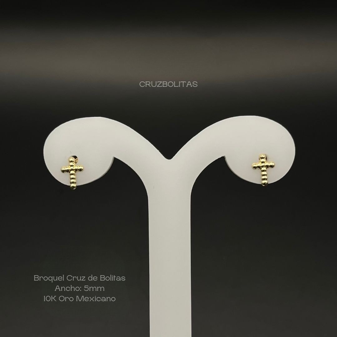 Broquel de 10k Mexicano con diseño de cruz de bolitas de 4mm de ancho. Precio sujeto a las cotizaciones diarias del oro.