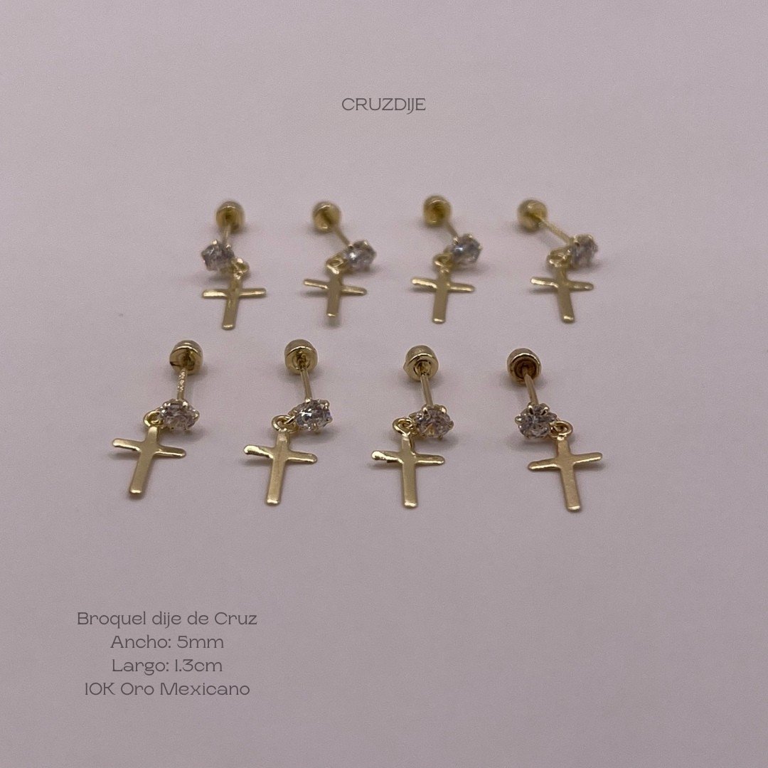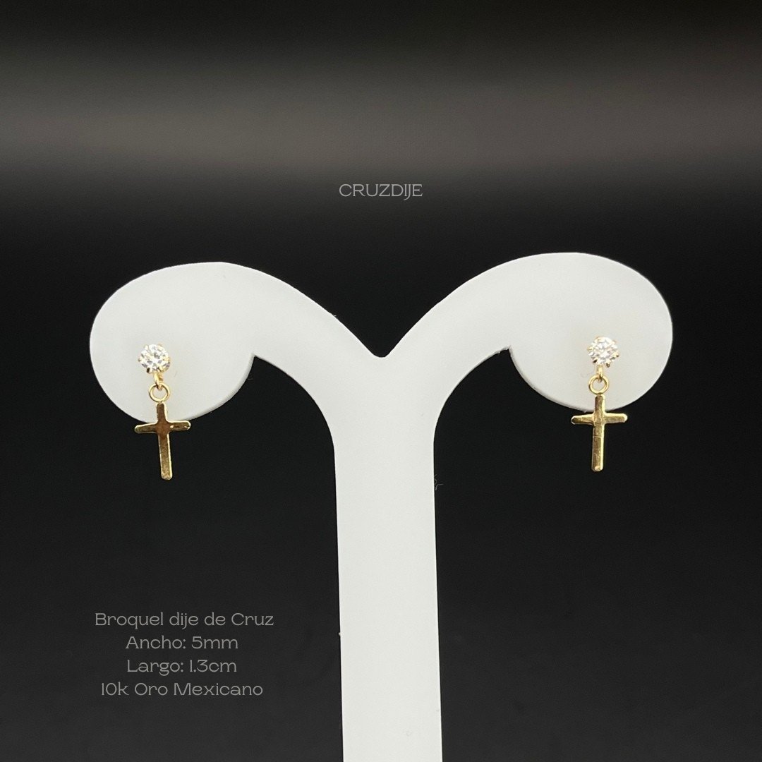 Broquel de 10k Mexicano con diseño de con incrustación de zirconia en la parte superior y con dijede una cruz lisa, de 5mm de ancho y 1.3cm de largo. Precio sujeto a las cotizaciones diarias del oro.