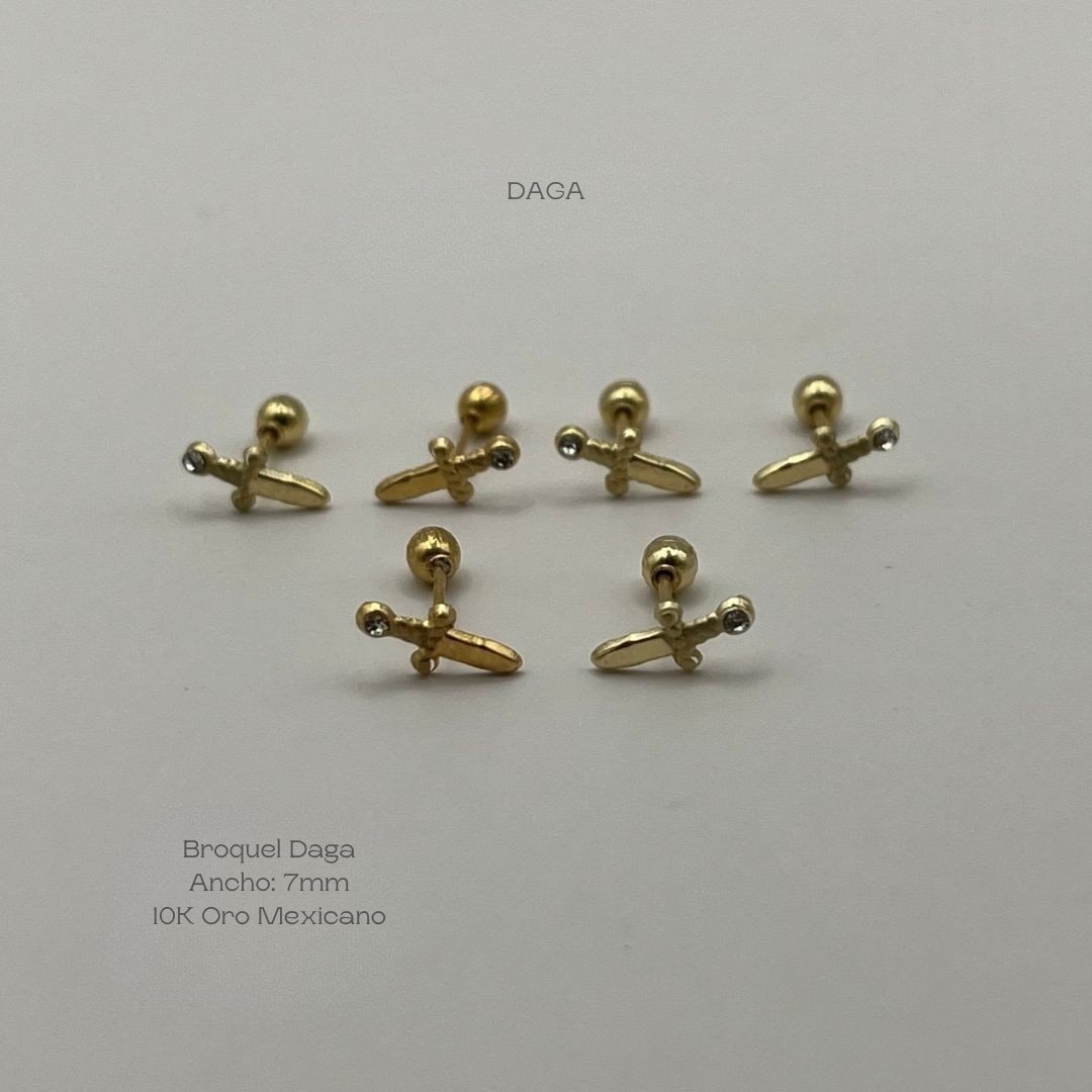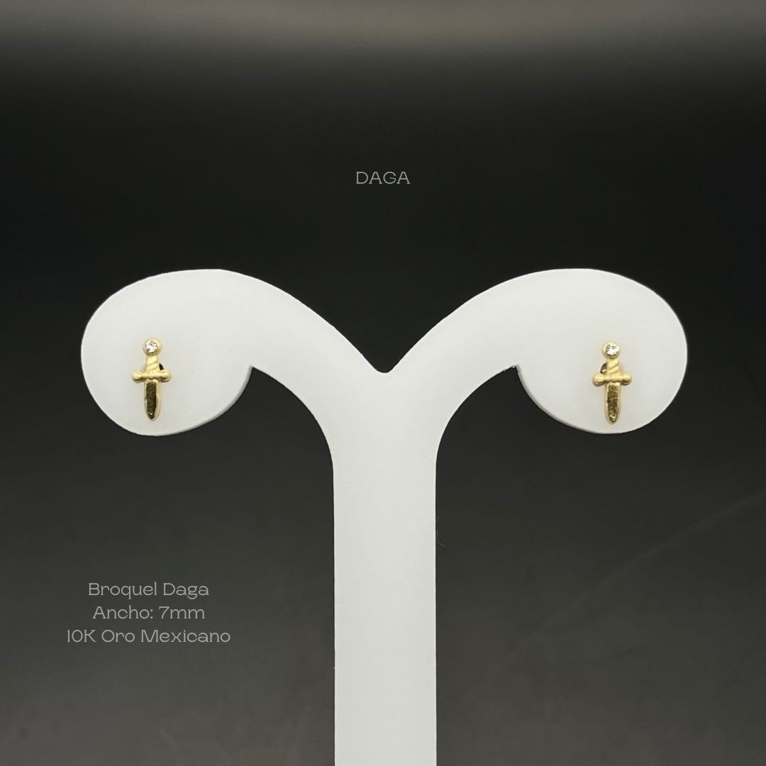 Broquel de 10k Mexicano con diseño de daga y una zirconia en la parte superior 7mm de largo. Precio sujeto a las cotizaciones diarias del oro.