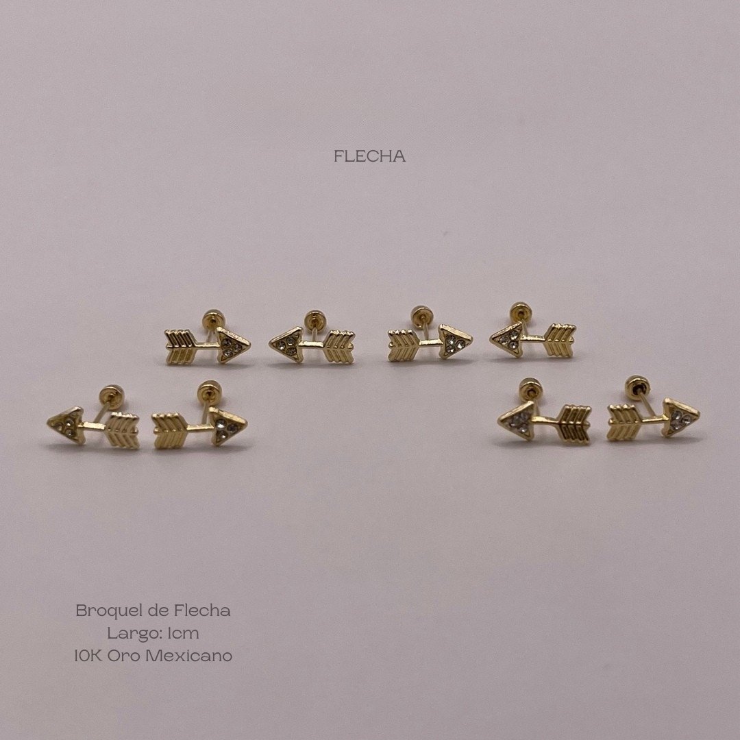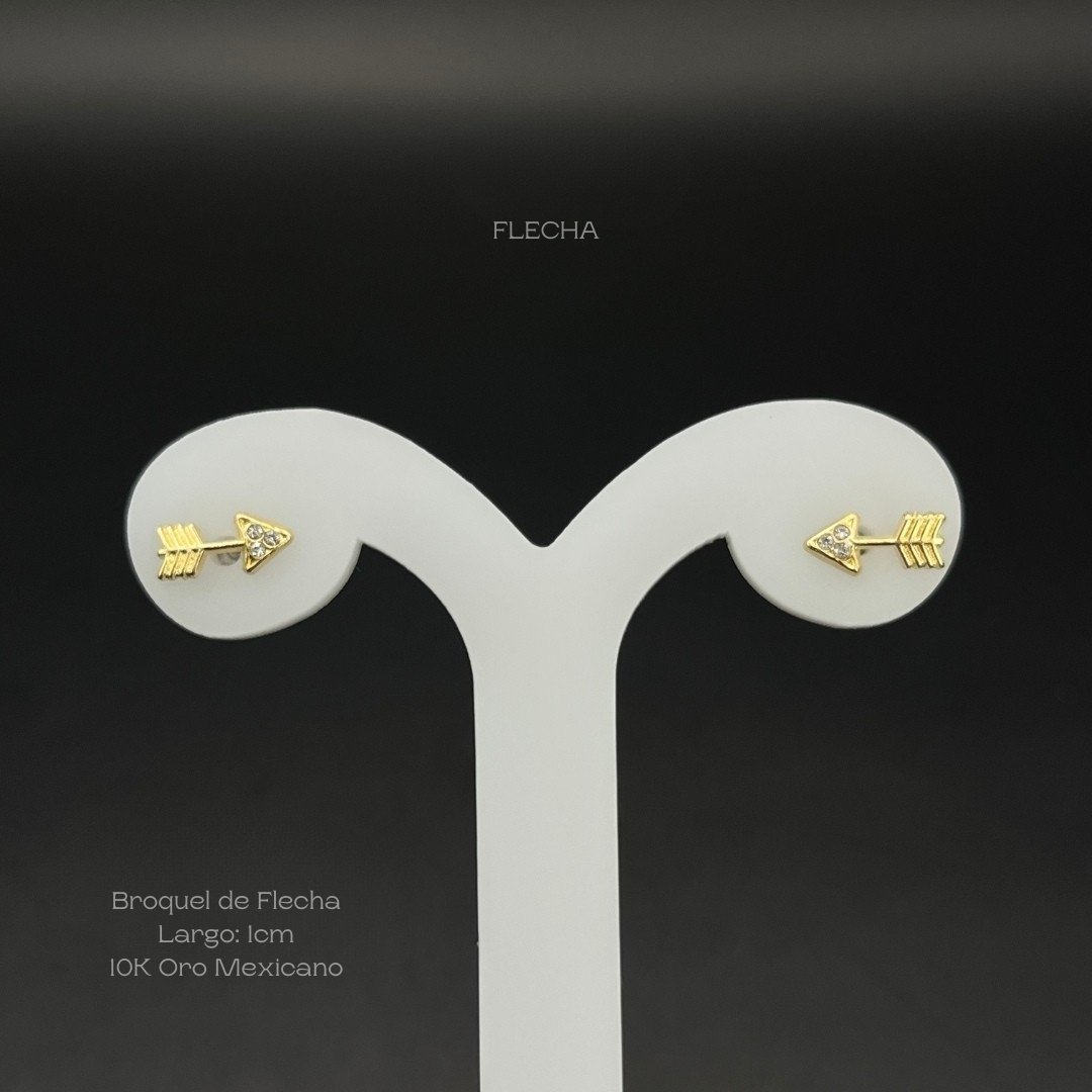 Broquel de 10k Mexicano con diseño de flecha con incrustación de zirconia en la punta, de 1cm de largo. Precio sujeto a las cotizaciones diarias del oro.