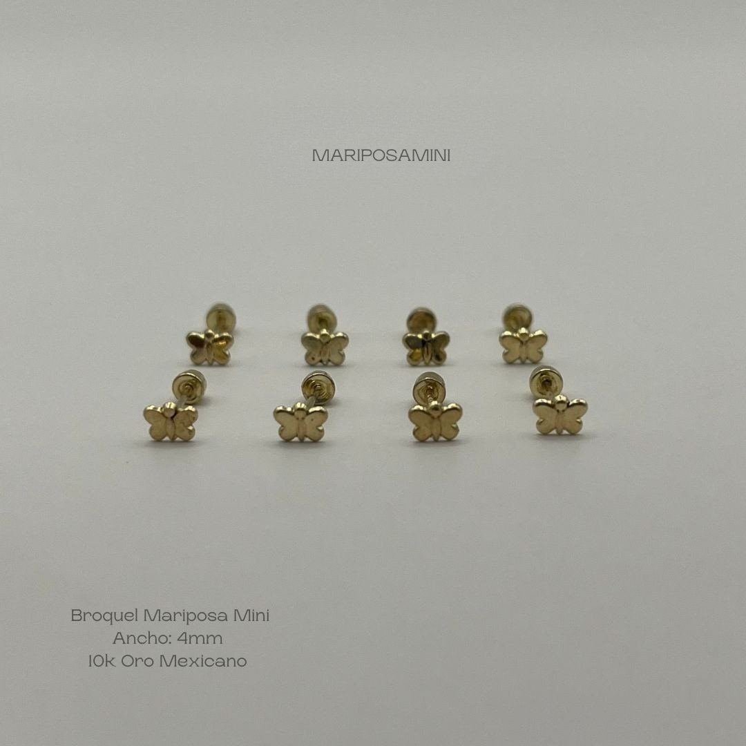 Broquel de 10k Mexicano con diseño de mariposa mini de 4mm de ancho. Precio sujeto a las cotizaciones diarias del oro.