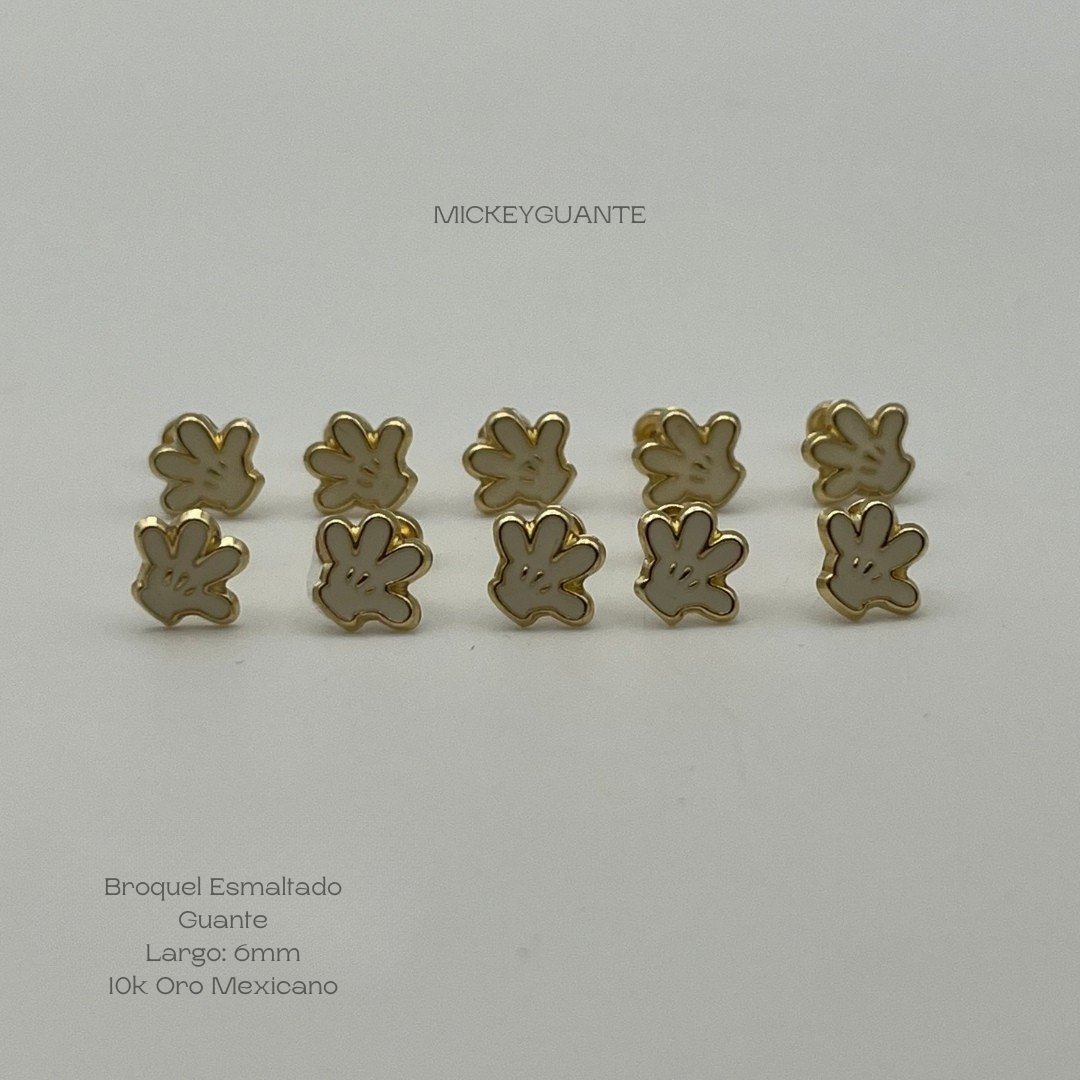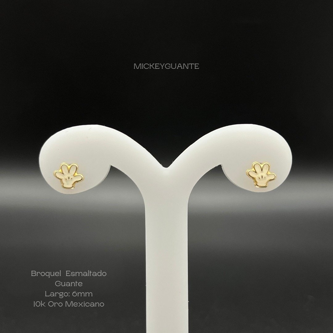 Broquel de 10k Mexicano con diseño esmaltado del guante de Mickey Mouse de 6mm. Precio sujeto a las cotizaciones diarias del oro.