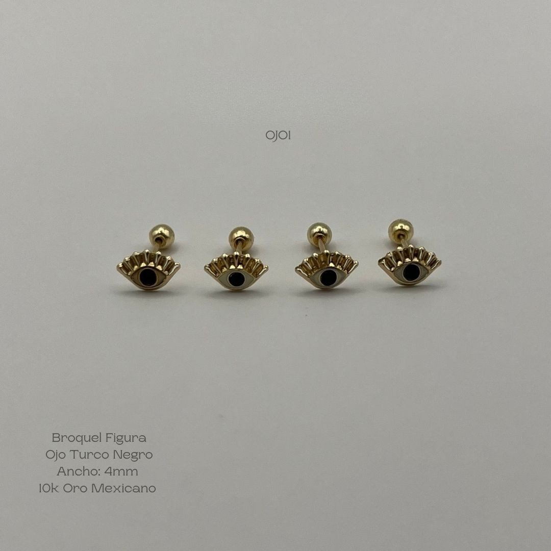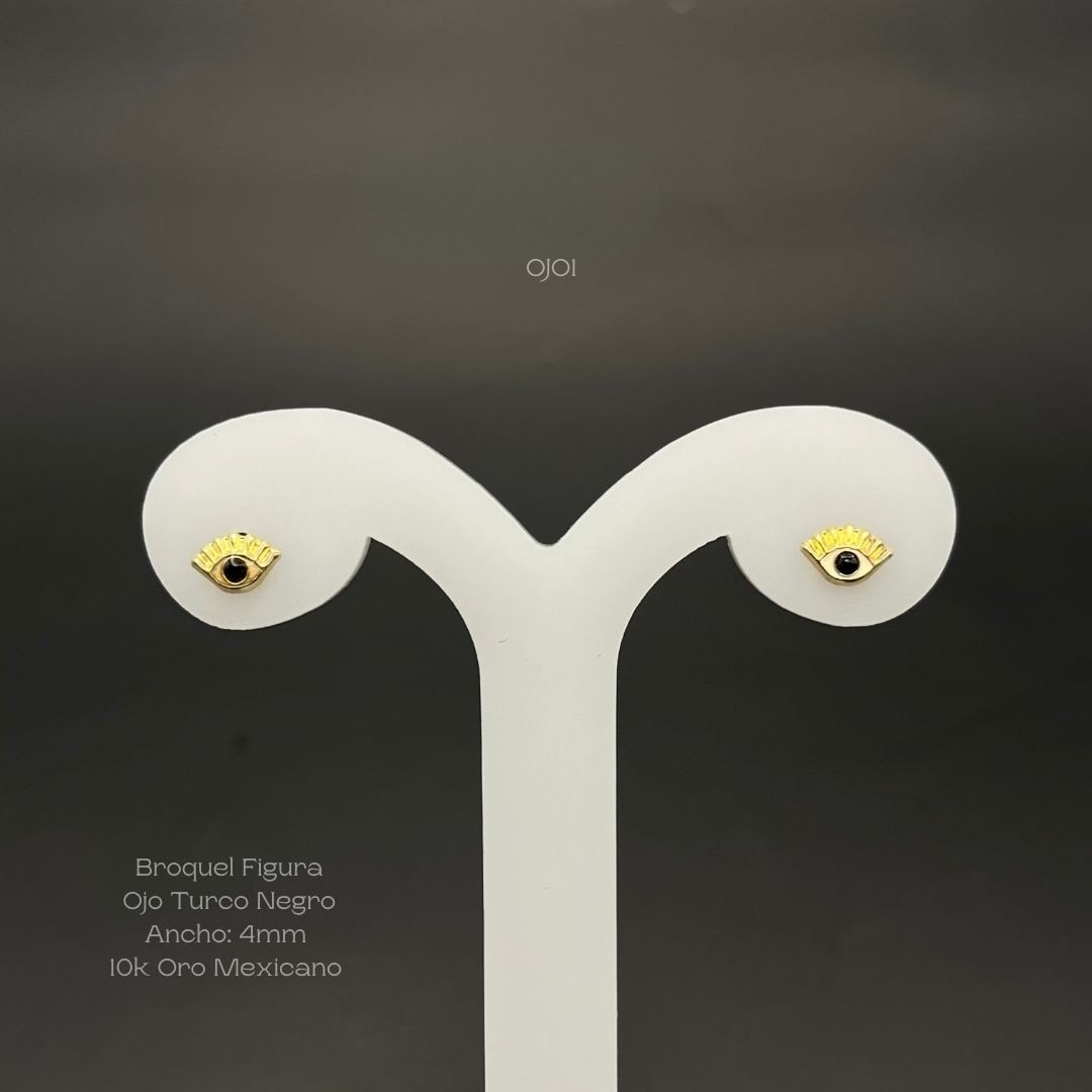 Broquel de 10k Mexicano con diseño ojo turco negro con esmaltado blanco y la pupila negra de 4mm de ancho. Precio sujeto a las cotizaciones diarias del oro.