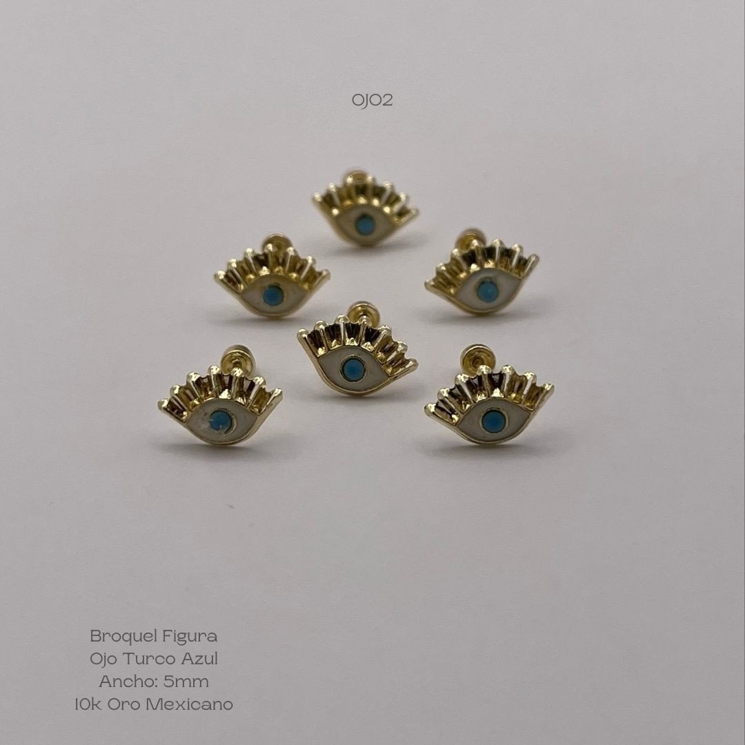 Broquel de 10k Mexicano con diseño de ojo turco, con esmaltado en color blanco y pupila en azul cielo de 5mm de ancho. Precio sujeto a las cotizaciones diarias del oro.