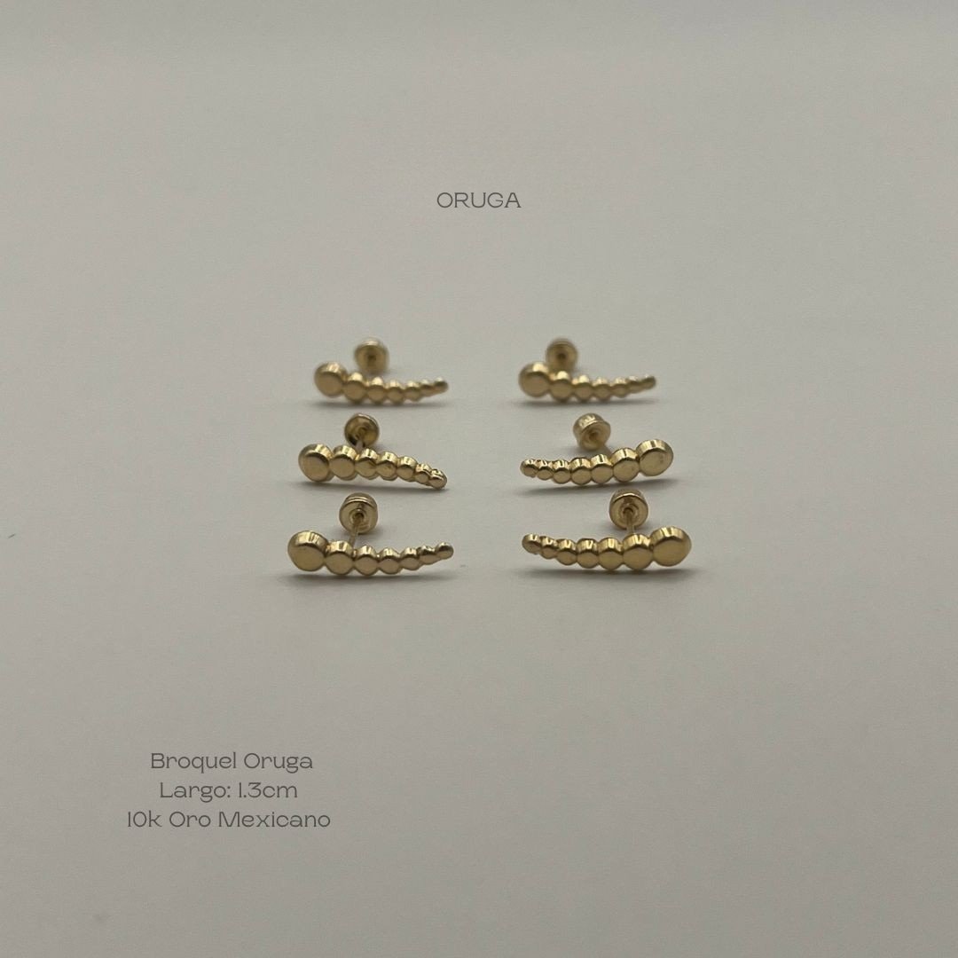 Broquel de 10k Mexicano con diseño de oruga de 1.3cm de largo. Precio sujeto a las cotizaciones diarias del oro.